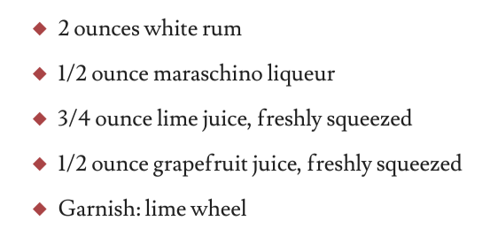 I wandered off from writing about writing to writing about cocktails because Hemingway makes a VERY, VERY short connection between the two. 😉 The Hemingway Daquiri is one of the best cocktails I’ve ever had in my life. Here’s the recipe, just put it in a martini shaker and serve it up. If you don’t have a daiquiri glass, just use martini (I get martini glasses at Dollar Tree because they are generally so unstable that it comforts me when they cost so little). By “maraschino liqueur,” it means “grenadine.” I shake it until there’s lots of ice chips, but purists strain them out: