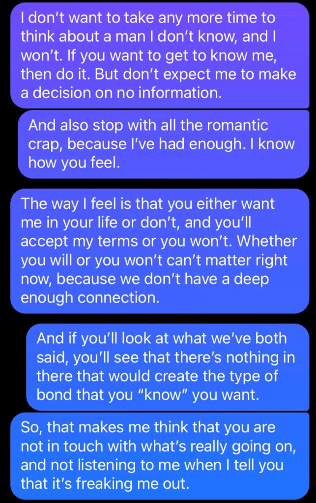 I have never in my lifetime been this strong in the beginning of a relationship because it sets the tone for the rest of it. If I donโt state my boundaries, heโll step all over them. He told me he wanted to marry me. Weโve been talking for a week and a half at most.